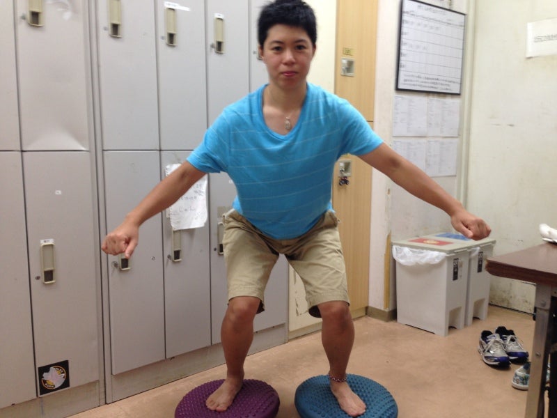 足の裏に敷いてあるのは「バランスディスク」という柔らかく、安定性の悪いものです。安定性の悪いものの上に立つことにより「足場」が鍛錬されていきます。ご家庭ではクッションなどで代用できるかもしれません。足場を安定させながらしゃがんだり立ち上がったりを繰り返します。