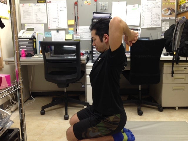 もうひとつは「肘の上抜き」というストレッチで肘を上方へ引き上げ、肩を前に押し出すようにします。それぞれ10回~20回×2~3セットこなし、肩甲骨が動くようになるのを感じ取ってみましょう。