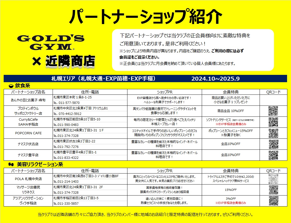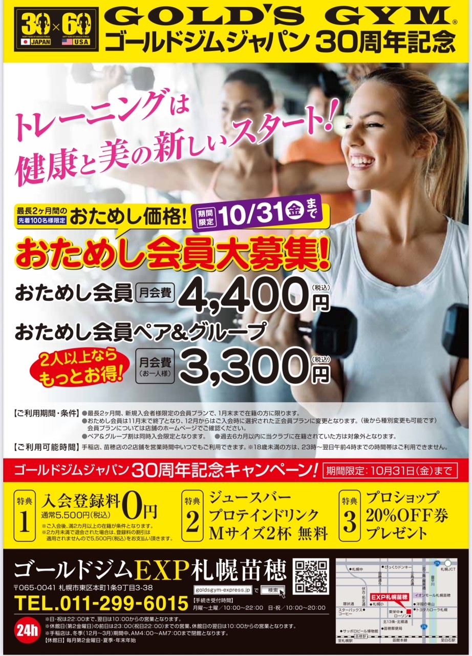 EXP(エクスプレス)会員 | 8,250円 | EXP札幌手稲・苗穂の2店舗が全営業時間利用可能 ※その他地区のゴールドジムは都度1,100円(税込)でご利用できます。 |