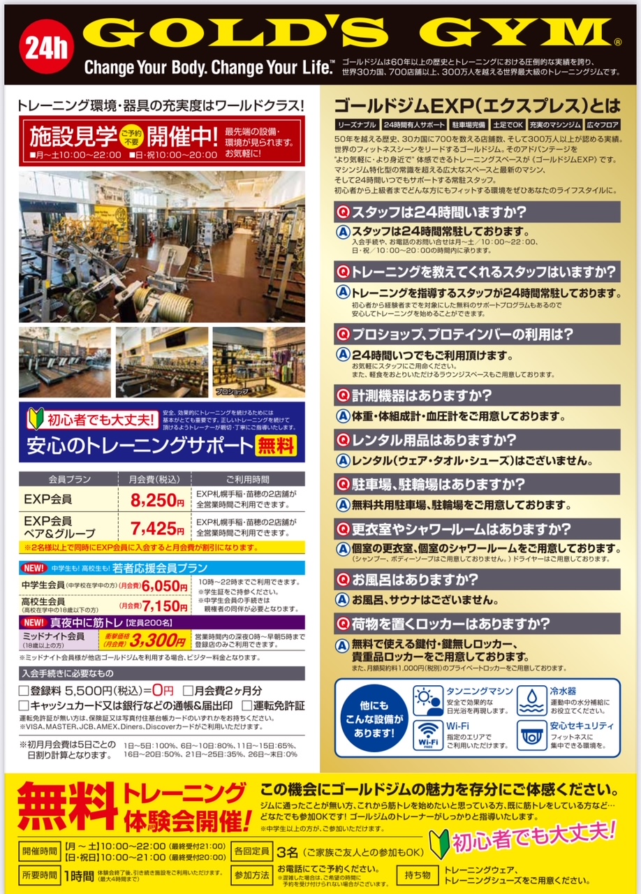 | EXP(エクスプレス)会員 | 8,250円 | EXP札幌手稲・苗穂の2店舗が全営業時間利用可能 ※その他地区のゴールドジムは都度1,100円(税込)でご利用できます。 |