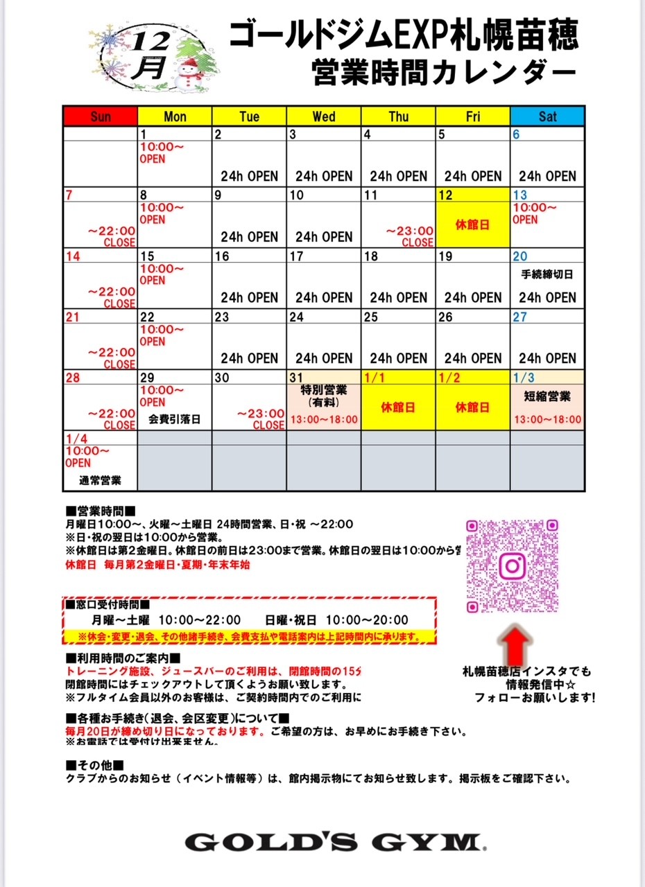 2025年12月 ゴールドジムEXP札幌苗穂営業カレンダー