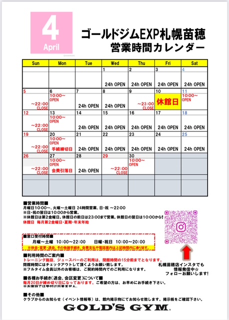 2026年4月ゴールドジムEXP札幌苗穂店 営業カレンダー