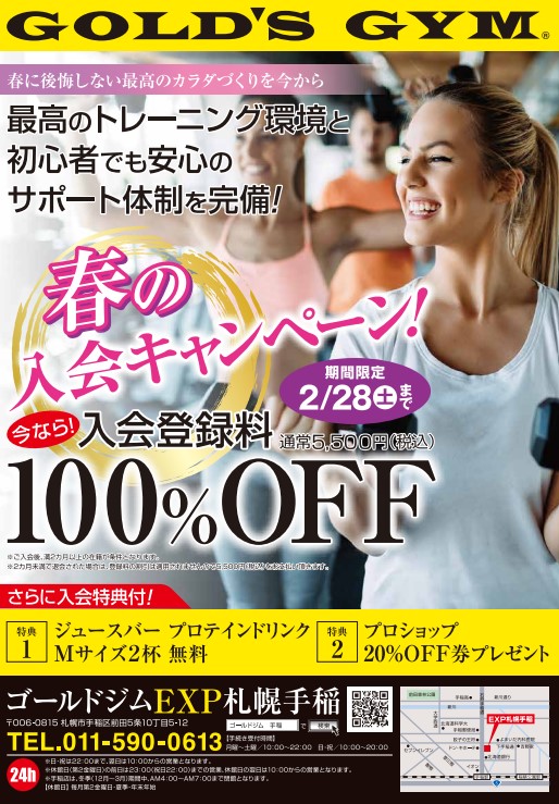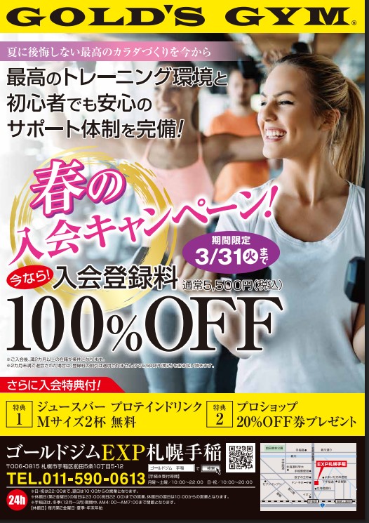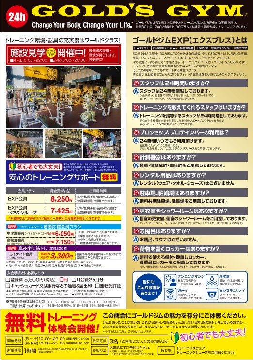 | EXP(エクスプレス)会員 | 8,250円 | EXP札幌手稲・苗穂の2店舗が全営業時間利用可能 ※その他地区のゴールドジムは都度1,100円(税込)でご利用できます。 |