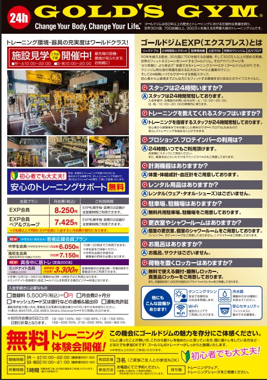 7,425円 | EXP札幌手稲・苗穂の2店舗が全営業時間利用可能 ※その他地区のゴールドジムは都度1,100円(税込)でご利用できます。 |