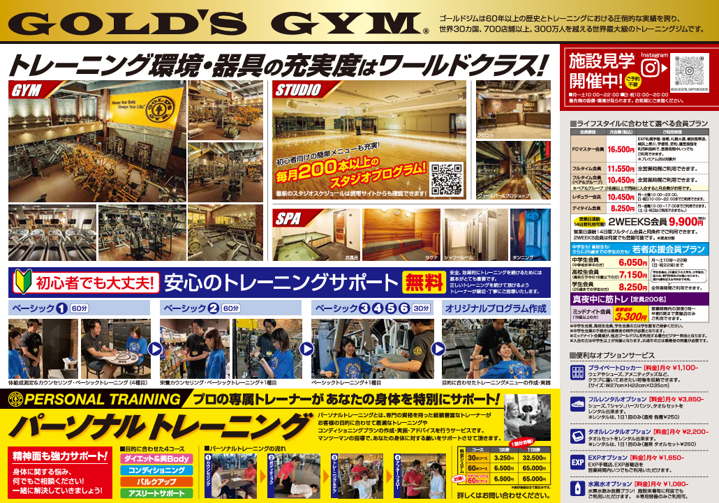 14,850円 | 営業時間中いつでもご利用できます。 横浜馬車道店、上星川店、宇都宮店、足利店、札幌手稲店、札幌苗穂店は無料で利用できます。 その他のゴールドジムは550円(税込)でご利用できます。 ※代々木公園プレミアム店は、1,100円(税込)でご利用できます。 |