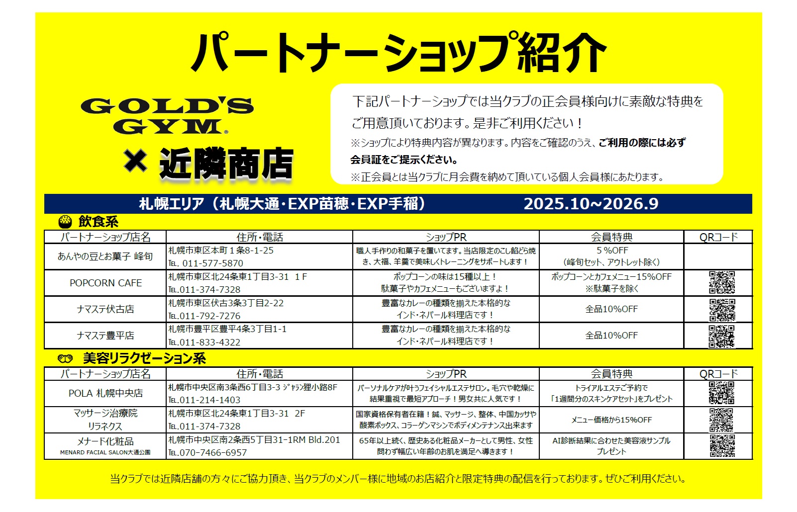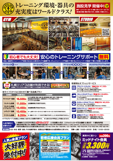 | FCマスター会員 | 16,500円 | 営業時間中いつでもご利用できます。 当店の他、横浜馬車道店、上星川店、宇都宮店、足利店、札幌手稲店、札幌苗穂店、GOLD’S GYM直営店は無料でご利用できます。 当店以外のFC施設は、550円(税込)でご利用できます。 ※代々木公園プレミアム店は、1,100円(税込)でご利用できます。 |