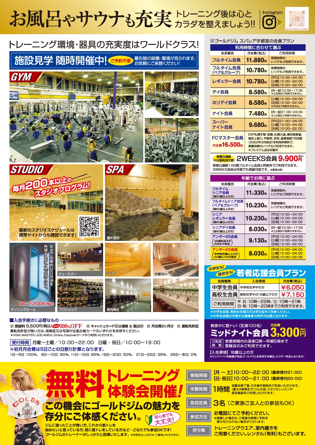 6,050円 | 【平日】10:00~22:00 【土曜】10:00~21:00 【日祝】10:00~20:00 *中学生会員の手続きは親権者の同伴が必要となります。 *手続きの際は学生証をご持参ください。 |